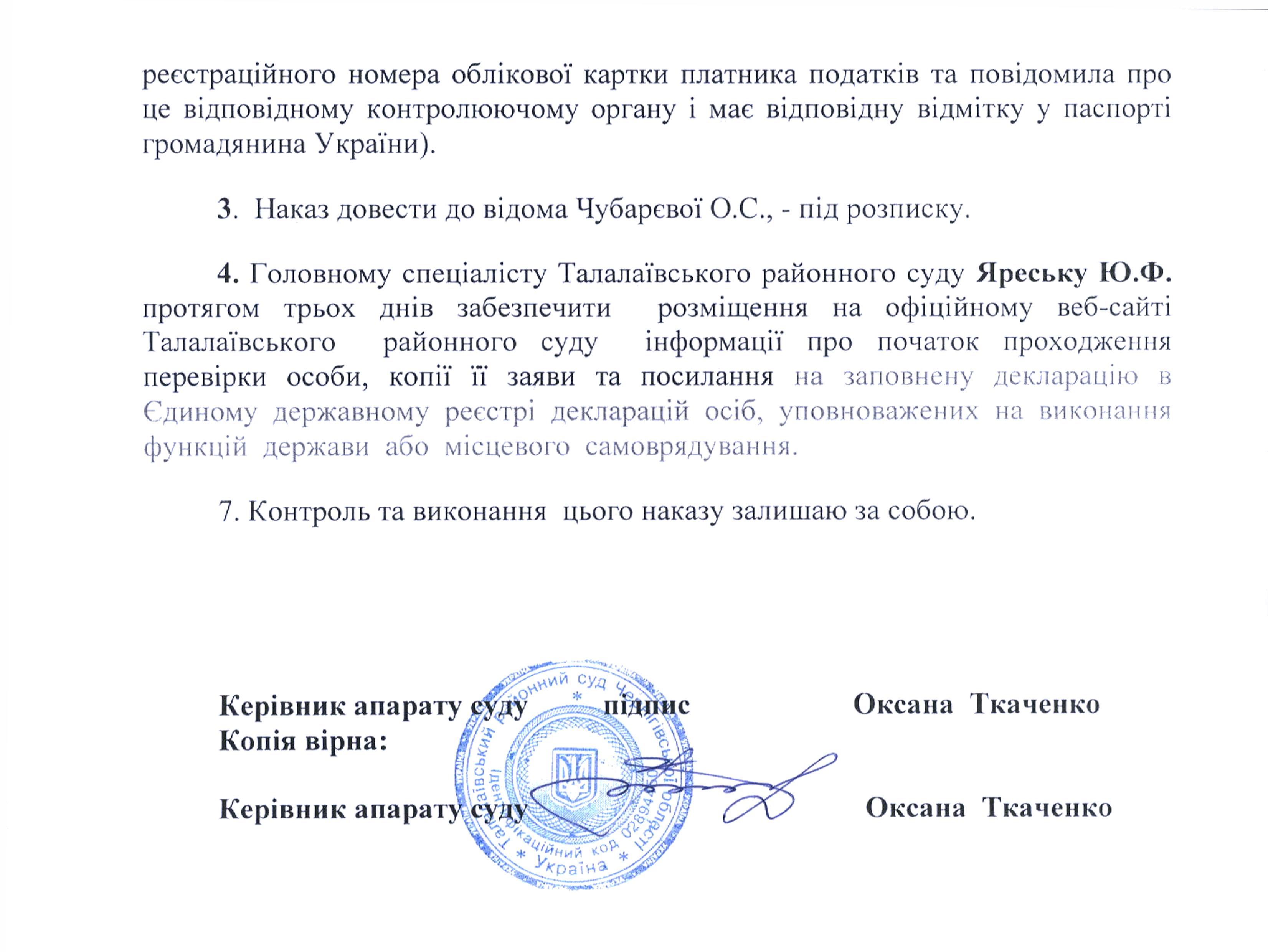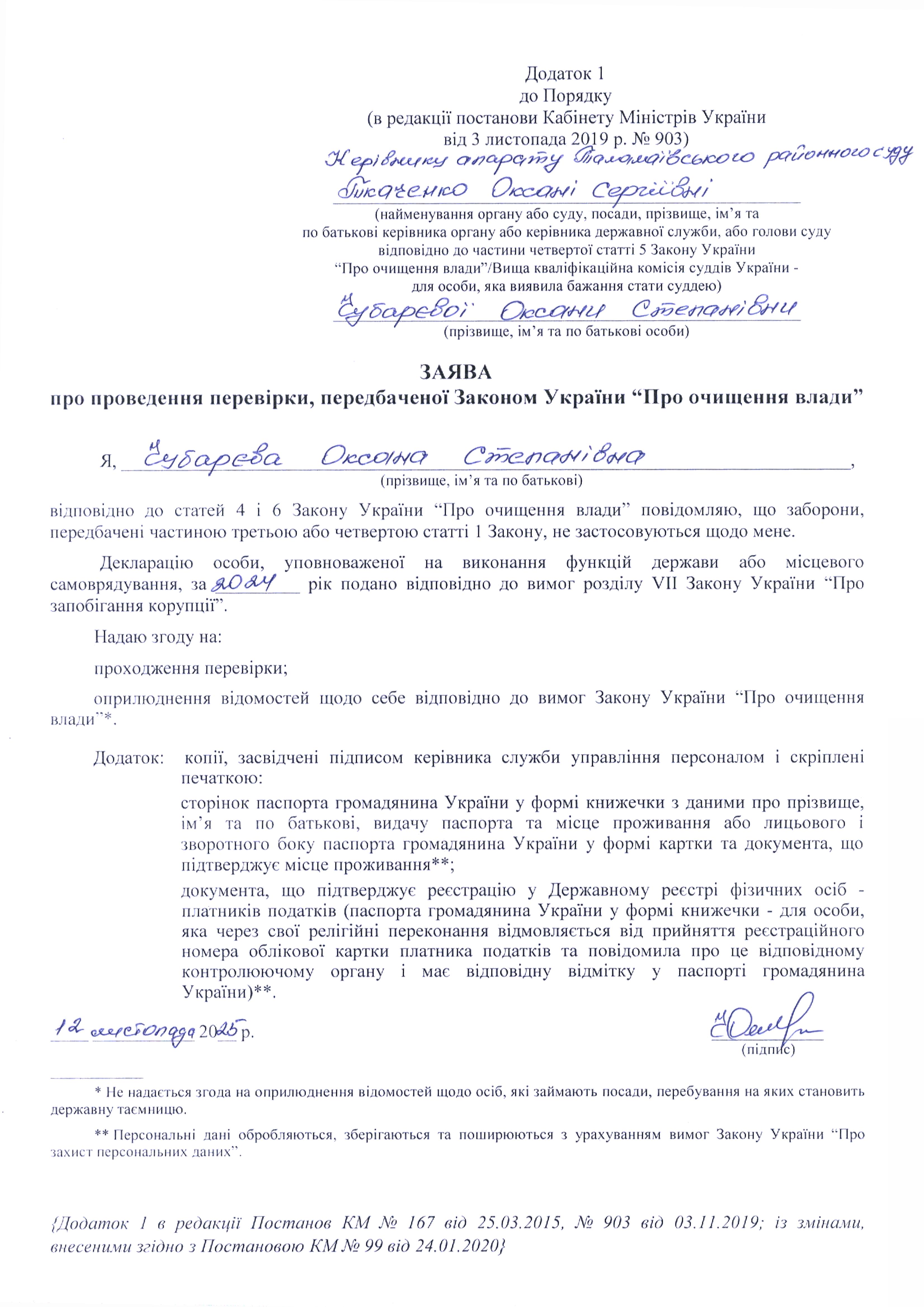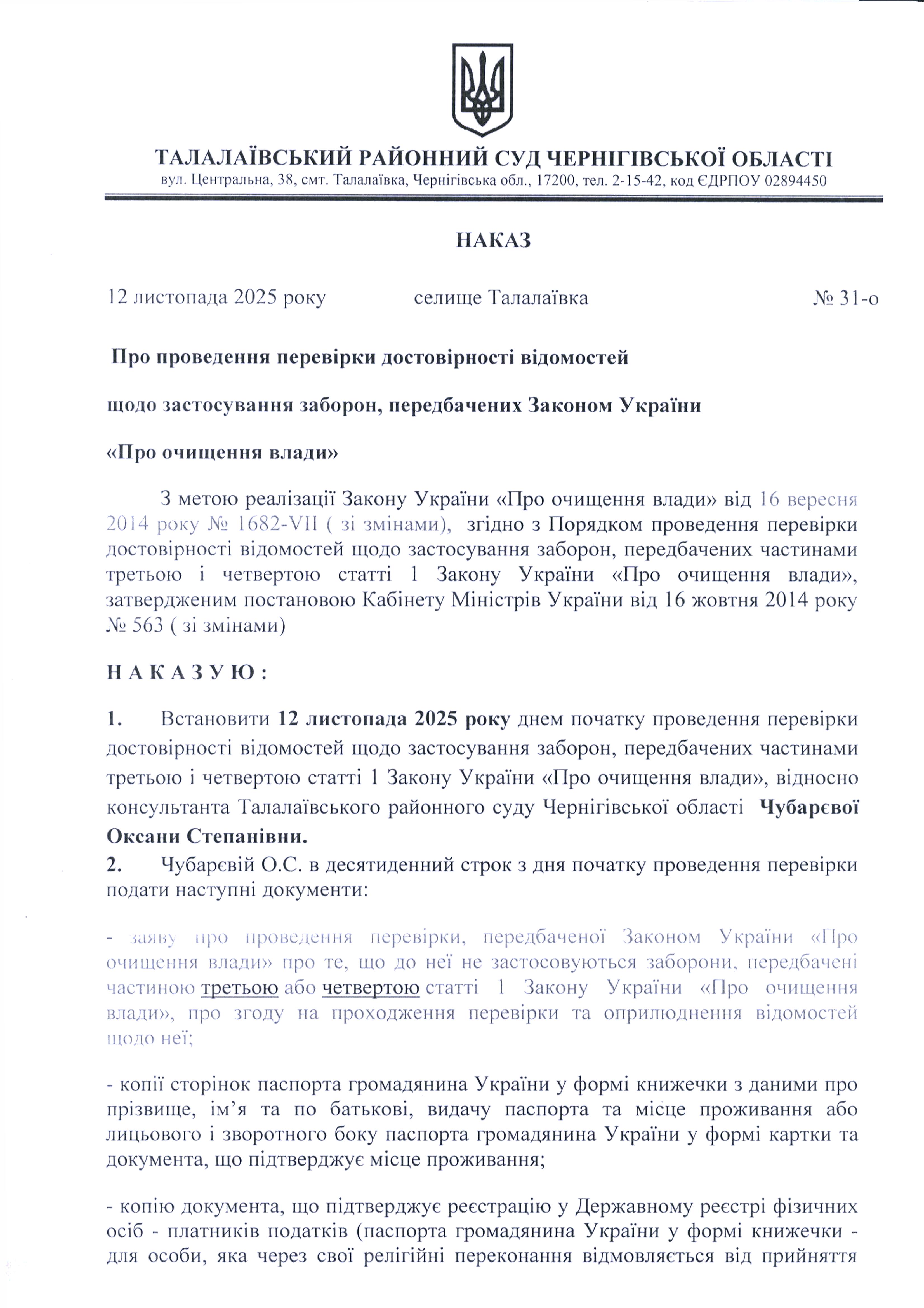 Про проведення перевірки згідно Закону України "Про очищення влади" відносно Чубарєвої О.С.